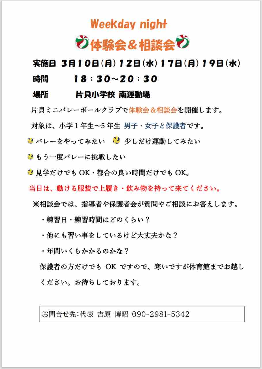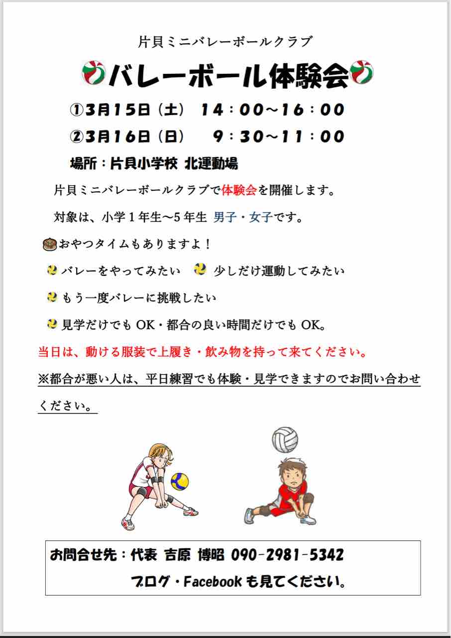 片貝町を中心に活動している小学生女子バレーボールチーム『片貝ミニバレーボールクラブ』のブログです。
